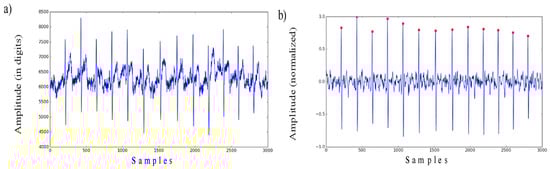 (a) Raw ECG signal and (b) ECG signal after filtering and normalization with the detected R peaks.