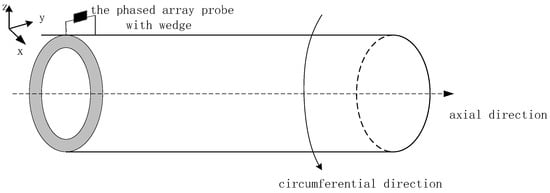 In actual testing, wedges are always used to couple the array to the tested material. In the inspection of circular tube material, according to its convex shape, the probe wedge needs to fit different inner diameters. So, acoustic field simulations are carried out under the convex cylindrical interface between the wedge and surface of the circular tube material. In the present study, a phased-array ultrasonic transducer was placed on the surface of the material, scanning along the circumferential direction of the material, as shown in Figure 1. The phased-array transducer was a linear transducer.