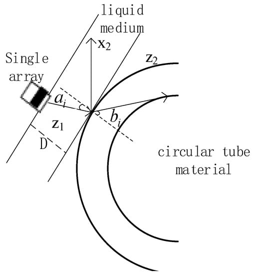where , , is the incidence angle of the longitudinal wave in liquid medium, is the refraction angle in the solid medium, is unit matrix in 2D, is the interface curvature of the circular tube material interface. In our present study, was a positive value because the boundary was raised against the liquid side from the solid side.