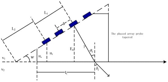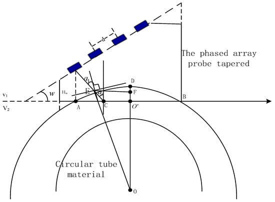 where is the midpoint height of the first element, is the height of the back end of the wedge, is the distance between the midpoint of the first array and the ultrasonic incident point, is the distance from the rear array to the horizontal line (the oblique contact surface), is the velocity of sound in the wedge, is the velocity of sound in the circular tube woven composite material specimen, is the spacing between the centers of adjacent arrays.