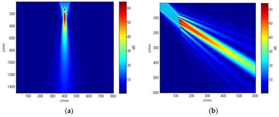 Furthermore, the probe was simulated on the basis of the finite-element method. The acoustic field in the case of a probe with two elements is shown in Figure 9a; Figure 9b is the acoustic pressure. We implemented the finite-element method in COMSOL 5.4 and windows 7. We obtained good agreement between our results and the finite-element results and validated the proposed method by comparing Figure 7a and Figure 9a.