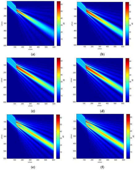 The acoustic field in materials with different curvatures: (a) acoustic field in material with a curvature of 1/0.35, with element width of 4 mm, and element length of 13 mm; (b) acoustic field in material with a curvature of 1/0.45, with element width of 4 mm, and element length of 13 mm; (c) acoustic field in material with a curvature of 1/0.5, with element width of 4mm, and element length of 13 mm; (d) acoustic field in material with a curvature of 1/0.6, with element width of 4 mm, and element length of 13 mm;(e) acoustic field in material with a curvature of 1/0.45 with element width of 5 mm, and element length of 15 mm; (f) acoustic field in material with a curvature of 1/0.5, with element width of 5 mm, and element length of 15 mm.