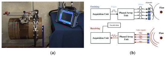 The experimental apparatus employed in this work consisted of five components: the excitation and acquisition equipment, the probe, the tested sample, a water injection device, an encoder for recording the UT data, as illustrated in Figure 10a. The excitation and acquisition equipment was an Olympus Omniscan MX2 scanner(16:64). A 5 MHz, 64-element linear transducer array was used in contact with the sample surface with water coupling; the water can be viewed as a wedge conforming to the curvature of the tested circular materials, the tested pipe sample was made of steel with pipe dimeter of 300 mm and wall thickness of 10 mm. The probe was set on the specimen surface and moved slowly along the circumferential direction of the material. The encoder was used to record the UT data and to store the received signals for further processing. The schematic diagram of the ultrasonic phased array is shown in Figure 10b. The parameters for the experiment are listed in Table 2. In this way, the C-scan image was obtained.