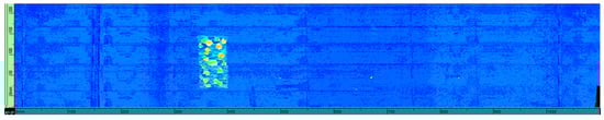 Figure 11 shows the C-scan image obtained by Olympus Omniscan MX2. Image detection data were processed by OmniPC-4.4R4 software for filtering and de-noising. In Figure 11, the C-scan displays color variation: the image color of the defect-free region of the specimen is uniformly blue, while the image color of the defect region is red or yellow. It is clear that the defect could be detected by using the model proposed in the paper.