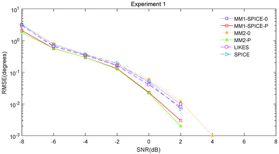 As shown in Table 1, the MM1-CD and MM1-SPICE algorithms had similar RMSEs and the MM1-CD algorithm took much more time than the MM1-SPICE algorithm. Considering that the MM1-CD and MM1-SPICE algorithms theoretically converge to the identical local solution, we believe that they will always have similar RMSEs. Moreover, the MM2 algorithm had the smallest iteration numbers, the least computational time and satisfactory RMSEs. In the following, we present the DOA estimation performance only of the MM1-SPICE and MM2 algorithms. Note that the MM1-SPICE and MM2 algorithms may converge to different local solutions, and then they are referred to as two different estimation methods hereinafter. Specifically, we compared the following six methods: