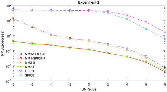 The RMSE comparisons of the above six methods are illustrated in Figure 1, Figure 2 and Figure 3 for Experiments 1–3 with different SNRs, respectively. Figure 4 and Figure 5 for Experiment 2 show the DOA estimation RMSEs of the above six methods versus the number of snapshots and the angle separation, respectively.