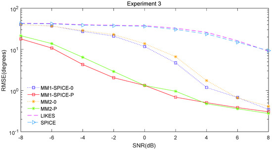 As shown in Figure 1, Figure 2, Figure 3, Figure 4 and Figure 5, we found that the penalized ML methods, i.e., the MM1-SPICE-P and MM2-P methods, had smaller RMSEs than the other four methods. As shown in Figure 4, with the increase of the number of snapshots, the performance of the MM1-SPICE-P and MM2-P methods improved but the performance of the MM1-SPICE-0 and MM2-0 methods remained virtually unchanged. Figure 5 shows that, as increased from to , the performance of the MM1-SPICE-P and MM2-P methods became better, while, when was larger than , the performance of the MM1-SPICE-0 and MM2-0 methods no longer improved. As shown in Figure 1, Figure 2 and Figure 3, unsurprisingly, as the SNR increased, the performance of all the six methods became better.