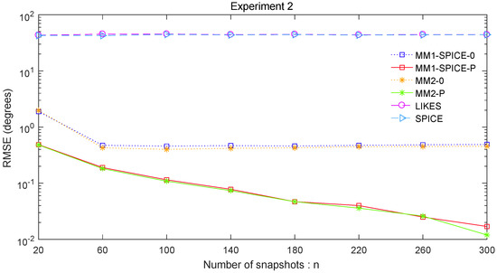 DOA estimation RMSE versus the number of snapshots n for Experiment 2 with and .