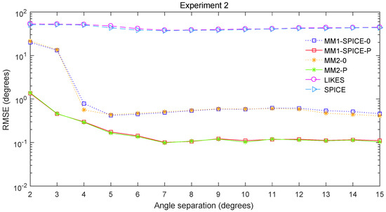 DOA estimation RMSE versus the angle separation for Experiment 2 with and .