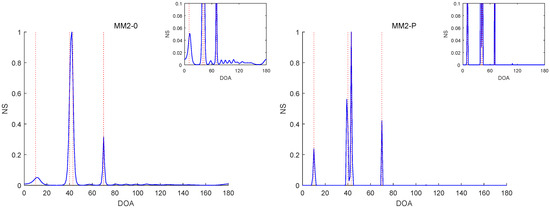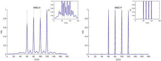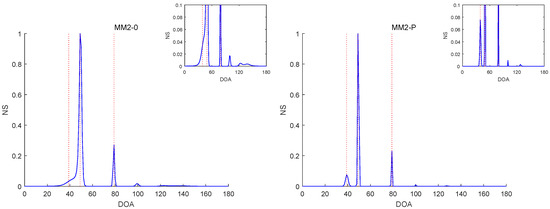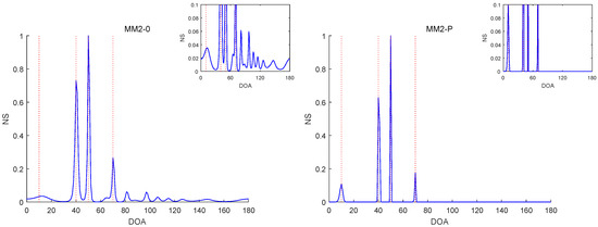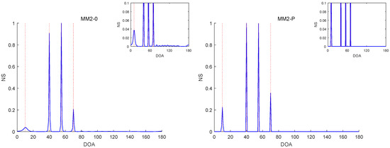 Figure 6, Figure 7, Figure 8, Figure 9 and Figure 10 report the NSs of Experiments 1–3 by the MM2-0 and MM2-P methods (the curves of the NSs of the MM-SPICE-0 and MM2-SPICE-P methods are similar to those of the MM2-0 and MM2-P methods, respectively). Figure 6 and Figure 10 are for Experiments 1 and 3 with , respectively. Figure 7 and Figure 8 are both for Experiment 2 with and , but they involve two scenarios with different angle separations. Particularly, Figure 8 is for the very small , as opposed to Figure 7 for . Figure 9 is also for Experiment 2, but it is about the scenario with small snapshot size , small and moderate angle separation . Note that the red dashed lines mark the true DOAs and the NS curves in each figure are the results of a randomly selected realization. We can clearly see in Figure 6, Figure 7, Figure 8, Figure 9 and Figure 10 that the MM2-P method having the -norm penalty added yielded a higher angular resolution.
