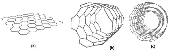 Molecular models of sp2-bonded carbon nanostructures: (a) graphene clusters, (b) single-walled carbon nanotubes (SWCNTs), (c) multiwalled carbon nanotubes (MWCNTs) formed from continuous concentric graphene tubes.