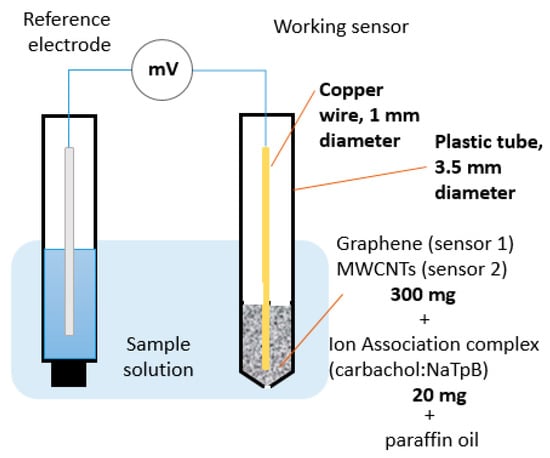 The experimental setup of the proposed sensors is illustrated in Figure 3. The sensing part of the proposed sensors was the carbon paste formed from incorporating ion-association complex of cationic carbachol and anionic NaTPB in the ratio of 1:1, along with nanoscale carbon materials and paraffin oil as binding agent. The positively charged quaternary ammonium group was found to have a high tendency to form an ion-pair complex with the negative borate ion. A potential developed across the interface between the carbon paste and the carbachol aqueous solution, which was concentration-dependent. The potential difference was measured between the proposed sensors separately and the reference electrode, and the value measured was directly related to −log [molar concentration of carbachol] according to the Nernst equation [34]. Slope values of the proposed sensors were about 60 mV/decade, which is the typical value for monovalent substances like carbachol, which has a quaternary ammonium group. The typical amount of binder added should be 15–42% w/w [35]. In this study, we found that adding paraffin oil to carbon nanomaterials in the ratio of 40%:60% w/w gave the most mechanically robust and stable paste. Both graphene and MWCNTs have large surface area and excellent thermal and electrical conductivity compared to conventional graphite. In our proposed sensors, there was no need for using hazardous plasticizer or volatile organic solvents because paraffin oil is sufficient to make a homogenous paste. As a result, the greenness of the method was enhanced. Solvent-free methods are considered to be the greenest option for any analytical method [36]. Most efforts in making chemical processes greener emphasize the need for using safer, less toxic, and more benign solvents, or the elimination of solvents altogether, and reduction in the use of reagents and auxiliaries.