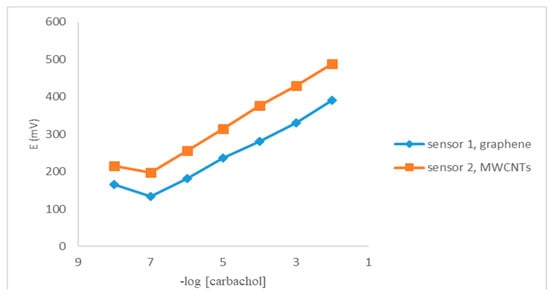 Fabrication of the proposed sensors using graphene and MWCNTs as electrode materials had a great, pronounced effect on sensitivity, stability, and the response time compared to ordinary scale-based sensors. A comparison between the proposed sensors and sensors investigated by the published ordinary scale method [28] is shown in Table 2. The mechanism of action is owed to the fast ion-to-electron transition offered by graphene and MWCNTs as nanoscale carbon materials, which allowed short response times for both sensors. Moreover, the lifetime was 1.5 and 2 months for sensors 1 and 2, respectively. Being excellent electrical conductors [1], nanoscale carbon materials can act as boosters to enhance the rate of electron transfer of electroactive species (ion-association complex). They also significantly improve the surface-to-volume ratio, which results in improved accumulation of carbachol molecules on the sensor surface and thus increase the sensitivity and selectivity.