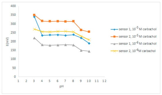 Two different concentrations were used to study the effect of pH on both sensors. 10−5 M and 10−6 M carbachol working solutions were used over the pH range 3–10 using diluted solutions of HCl and NaOH. The results showed that both sensors exhibited constant potentials over pH range 4–8, as shown in Figure 5. Therefore, this range was used as a working pH range for the fabricated sensors. Results showed that, above pH 8, the potentials became lower, which may be caused by the instability of carbachol at alkaline pH and its degradation to choline.
