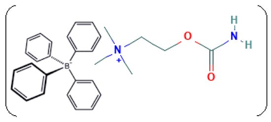 The present study originated from the fact that carbachol is a positively charged quaternary ammonium choline ester that acts as a cationic exchanger, which reacts with NaTPB as an anionic exchanger. It has been found that NaTPB is the optimum anionic exchanger due to its suitable grain size and low solubility. The proposed structural formula of the ion-association complex formed is shown in Figure 6.