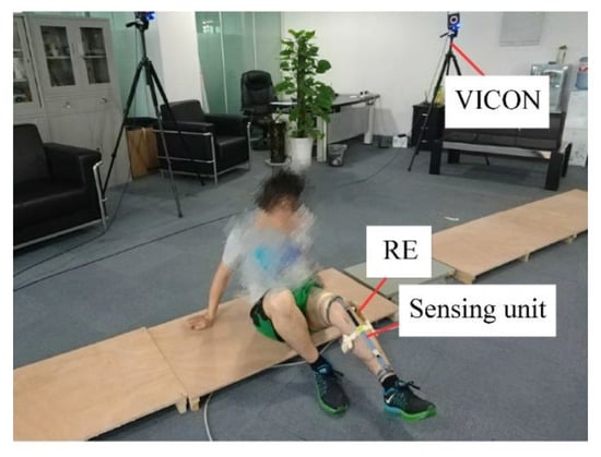 The subject was asked to sit on the ground and perform knee extension and flexion movements. A six-camera optical motion capture system, VICON (T40s, Oxford, UK), acted as the gold standard for measurement. A wearable sensing system was developed to capture knee joint movements. The data of RE and the flexible fabric sensor were recorded simultaneously with the VICON.