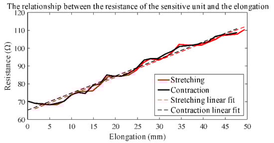 The results of tensile testing are shown in Figure 4. The curves of the stretching test and the contraction test are not completely linear, and there are some fluctuations which are decided by the design principle of the sensor. Two linear functions are used to fit the two curves.