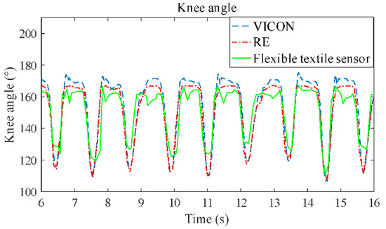 The comparison of angle measurement with the electrogoniometer (RE) and VICON systems, and the flexible textile sensor.
