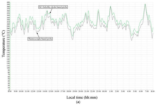 The output signals of both temperature sensor pairs (SiC-Schottky and thermocouple) were monitored simultaneously in the control room of the factory. The temperature waveforms are shown in Figure 14, measured at the mill input (Figure 14a) and its output (Figure 14b).