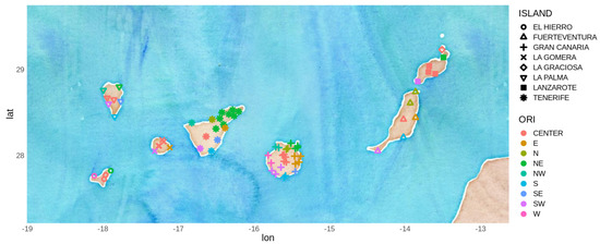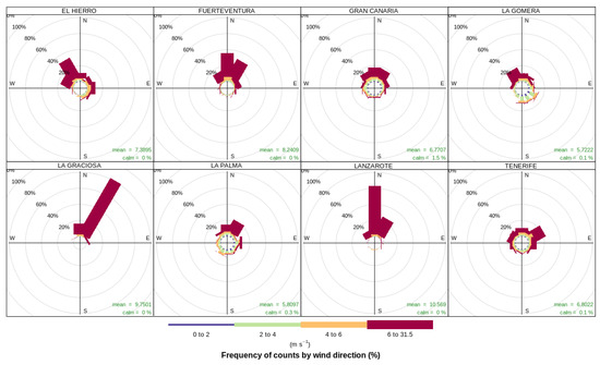 In Figure 3 can be seen that there is a clear northern component for winds in the Canary Islands, known by the scientific community as “trade wind” for its historical implications in the Spanish and Portuguese trade with Central and South America during and after the 16th century. That figure considers only the windiest month in 2018, which was July, for each island. This image is shared to show that even when there is a predominance of northern winds in July, the wind roses for the eight islands are quite different. According to [36,37], this archipelago presents numerous micro-climates. Therefore, a model trained to predict wind has to be generalizable.