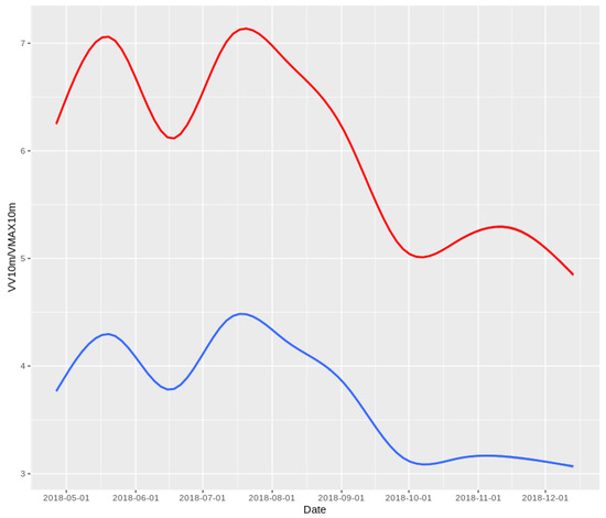 The variable used for wind forecasting was VMAX10m, which is the maximum speed of wind (m/s). In Figure 2 is represented both VMAX10m and VV10m, which is the average wind speed, both smoothed across the sampled period using a generalized additive model (GAM, [34]) provided by the ggplot2 library [35].
