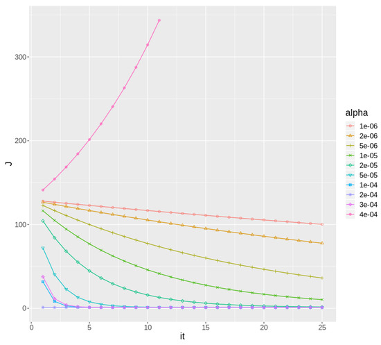 Figure 4 shows the learning curve corresponding to the first batch of data for weather station ID “C619Y”. It can clearly be seen how different values of mean different behaviors of the gradient descent algorithms. Small values of mean a slow convergence, even too slow to converge in a timely manner. And larger values may mean too large jumps in the J space, even preventing convergence in some cases.