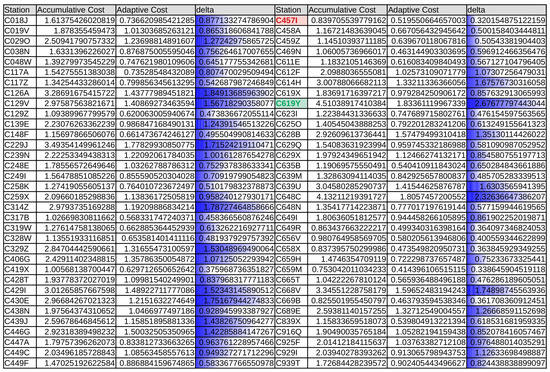 Mean accumulative and adaptive cost ((m/s)) for weather stations (estimated values vs. observed values for the two strategies) and difference between the two.