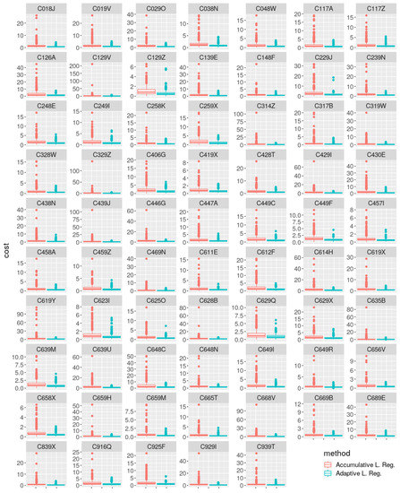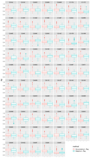 The results of the application of the methodology based on data stream (“adaptive”) versus the linear “accumulative” method are presented. Both strategies were explained in the previous section. In the table depicted in Figure 5, the average cost (mean squared error, MSE) values obtained with both methodologies across the entire data-set are listed. The adaptive strategy was always superior to the accumulative strategy, as can be observed in the “delta” column (Accumulative Averaged Cost—Adaptive Averaged Cost).