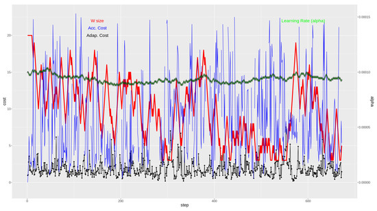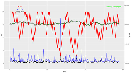 If Figure 7 and Figure 8 are observed with attention, the concept changes can be indirectly detected by noting the rapid reduction of the window size (in red). In those episodes, it becomes apparent that the model built with the accumulative strategy (in blue) has a large peak in the calculated cost. However, the adaptive strategy has a much more contained behavior, seemingly due to its adaptation to the new concept to be modeled.