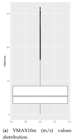 Figure 11 shows the boxplot representation of the coefficient of determination Equation (7) calculated through the study period for both models. is a statistic measure that gives information about the goodness of fit of a model. It tells how much of the variance of the response variable (VMAX10m in our case) can be explained by the model, or how well the regression model approximates new observations.