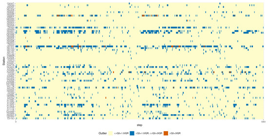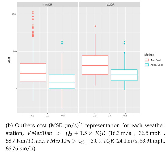 In Figure 9b, the box-plot representation of the cost obtained across all of the weather stations during the outlier VMAX10m speed episodes is shown. In Figure 10, the considered VMAX10m outlier events are represented for the whole period studied. The episodes of maximum wind speed above the first threshold represent 6.39% of all observations, while the episodes of maximum wind speed above 24.1 m/s account for 0.21%.