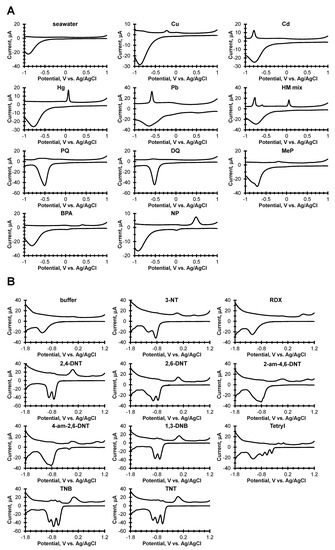 Electrochemical signatures for each compound. (A) Chemicals in seawater. (B) Explosives in buffer from reference [8].