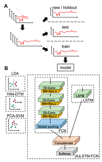 The following are available online at https://www.mdpi.com/1424-8220/19/10/2392/s1, Table S1: LSTM cell number and batch size parameters for neural networks in the study, Figure S1: Batch size and LSTM cell number optimization for LSTM, Figure S2: Batch size for FCN, Figure S3: Batch size and LSTM cell number optimization for LSTM-FCN, Figure S4: Batch size and LSTM cell number optimization for ALSTM-FCN, Figure S5: Representative CAMs of each class in SW-4, Figure S6: Representative CAMs of each class in SW-11, Figure S7: Representative CAMs of each class in EXP-3, Figure S8: Representative CAMs of each class in EXP-11, Figure S9.: Confusion matrix for (A) 4-SW, (B) 11-SW, and (C) 11 SW datasets.