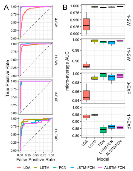 Since the macro-average F1-scores with a fixed classification threshold are relatively incomplete indicators of classification performance particularly on datasets with class imbalances (here, 4-SW and 11-SW), we sought to further investigate classifier performance using a second evaluation metric: Receiver Operating Characteristic (ROC) curves. Representative micro-average ROC curves for each algorithm tested on the 4-SW, 11-SW, 3-EXP, and 11-EXP datasets are shown in Figure 3A. Both relatively high true positive (TPR) and 1-false positive rates (1-FPR) for all models were seen for each of the datasets with sufficient sample size per class, whereas noticeably lower TPR and 1-FPR is seen in the case of 11-EXP, which contains 3-samples per class in the training and test sets. For each of the datasets, 11-EXP excluded; the ROC curves of LSTM, FCN, LSTM-FCN, and ALSTM-FCN were largely overlapping, making interpretation difficult and necessitating use of the area under the curve (AUC) values. ROCAUCs were calculated from micro-average ROC curves making use of repeated (25 replicates) training-test splits for each algorithm on each of the four datasets. Boxplots of these results are shown in Figure 3B, tested on each dataset in the study. From this analysis, the highest median of the micro-average ROCAUCs achieved for each dataset were as follows: 1.000 on 3-EXP using FCN, 0.999 on 11-SW using ALSTM-FCN, 0.995 on 4-SW using ALSTM-FCN, and 0.946 on 11-EXP using LSTM. For each of the datasets except 11-EXP, the four LSTM models yielded significantly higher micro-average ROCAUC values than LDA (p < 0.05). In this study, 11-EXP was found to be the most challenging for the models utilized, where LSTM and LDA were the best performing models with median ROCAUC values of 0.946 and 0.938, respectively. Interesting was the relatively high level of performance by LDA, which may result from the smaller sample size in 11-EXP which likely has a larger negative impact on deep learning models. ROCAUC summary data (median and IQR) are provided in Table 2.