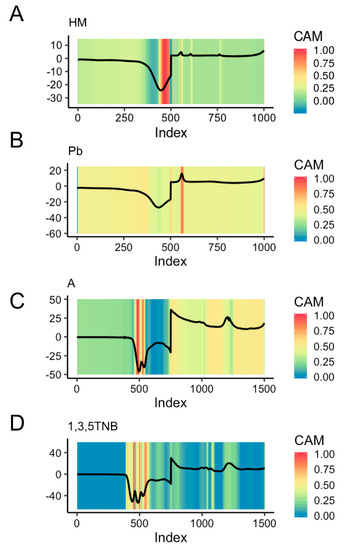 Information that fully convolutional network (FCN)-containing models provide. (A) Class activation map (CAM) for 4-SW. Representative HM sample is shown. (B) CAM for 11-SW. Representative Pb sample is shown. (C) CAM for 3-EXP. Representative A sample is shown. (D) CAM for 11-EXP. The representative 1,3,5-TNB sample is shown.