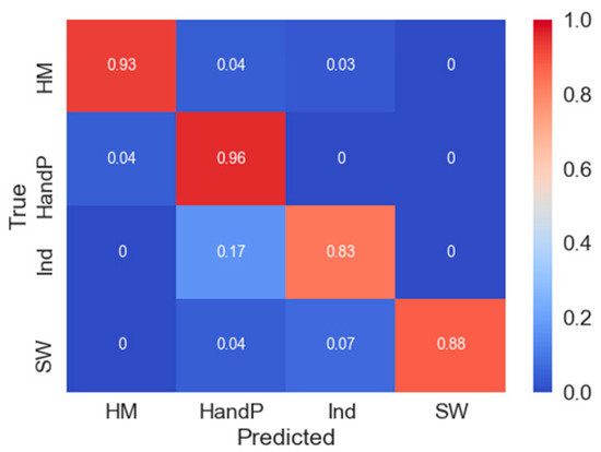 Finally, as a simple assessment of CAMs utility, we truncated the 4-SW dataset. Using the CAM from each of the classes of heavy metals (HM), herbicides and pesticides (HandP), industrial phenols (Ind), and seawater (SW) (Figure S5), the decision-making process of the highest-performing model—in the case of 4-SW, ALSTM-FCN—is concentrated around the middle of the concatenated dataset. Using the CAM as a guide, the new smaller 4-SW dataset was created by trimming 4-SW down from 1002 to 400 (in terms of index size), removing the first 502 and last 100 data points resulting in a dataset largely only retaining the anodic stripping peaks found in the chemicals in seawater samples. Following training on this new truncated dataset, the confusion matrix when evaluated on testing data demonstrates largely retained classification ability of the LSTM-FCN (Figure 5), when compared to the best performing LSTM-FCN model on the entire dataset (Figure S9A). Overall, this simple example suggests that CAMs may be useful as a form of filtering of CSWV data for content that is deemed necessary for classification.