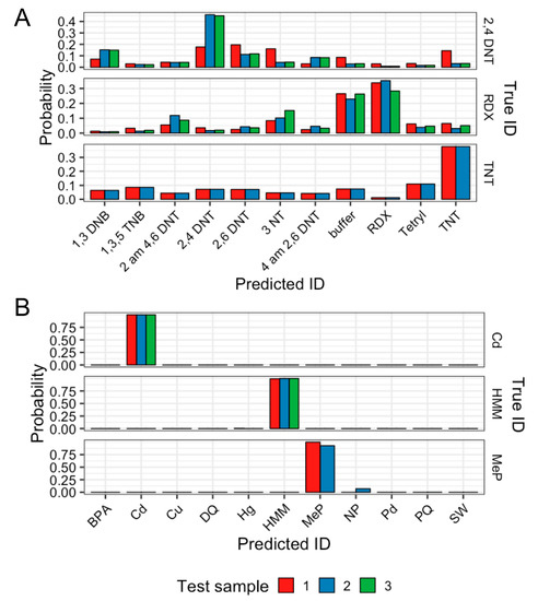The more performant ALSTM-FCN model successfully correctly classified each sample, with no second-choice probability higher than 0.1 (Figure 6A). This result was consistent with the perfect classification observed in some of the training-test splits (Figure S9B). In contrast, the performance of the LSTM on 11-EXP yielded 7 out of 8 correct assignments, with one 2,4-DNT sample incorrectly assigned as 2,6-DNT (Figure 6B). Notable was the higher uncertainty of the predictions the model provides on the 11-EXP data, possibly related to the smaller overall sample size for the 11-EXP dataset, relative to 11-SW, and associated lower ROCAUC values for the evaluated models on 11-EXP.