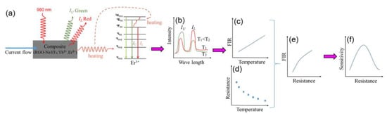 It has been widely reported that the lanthanide-ion doped NaYF4 with low phonon energy is the most commonly used optimal host material in up-conversion applications, since the nonradiative relaxation can be restrained efficiently [,]. Recently, the NaYF4:Yb3+,Er3+ fluoride nanomaterials have been reported for applications in biological imaging, solar cells, anti-counterfeiting, and optical sensors as multi-color phosphors [,,,,,]. It was found that reduced graphene oxide (RGO) with outstanding carrier mobility and high surface-to-volume ratio had been applied in material science, energy, and biomedicine [,]. The composite material composed of RGO and NaYF4:Yb3+,Er3+ will show bi-functional properties such as fluorescence and negative temperature coefficient (NTC) resistive element [,,]. Since the fluorescence features of NaYF4:Yb3+,Er3+ are various, and the conductive characteristics of RGO can be affected by external disturbance of composite on account of its low density state surrounding the Dirac point [], the resistance of composite material (RGO-NaYF4:Yb3+,Er3+) will be detected by using the spectrum property of NaYF4:Yb3+,Er3+ nanoparticles. In this paper, we design the composite nanomaterial (RGO-NaYF4:Yb3+,Er3+) as a variable-resistance sensor. The theoretical analysis process for detecting variable resistance by FIR technology is proposed, as shown in Figure 1. Since the current flowing the composite (RGO-NaYF4:Yb3+,Er3+) changes, the generated Joule heat changes and the adjacent energy levels (the upper level and lower level) of Er3+ can be thermally populated and depopulated in the photoluminescence process (Figure 1a). Therefore, the fluorescence intensity of IU and IL will change upon 980 nm excitation (Figure 1b). The FIR between IU and IL will change regularly and the temperature dependent FIR can be obtained according to Boltzmann distributing law [,,], as shown in Figure 2c. The relation between temperature and resistance can be obtained from dependence of resistance on temperature according to Steinhart–Hart formula [,,] in Figure 2d. Based on the above analysis, the FIR and relative sensitivity as a function of resistance can be derived, as shown in Figure 2e,f. Thus the variable resistance can be detected by FIR technology.