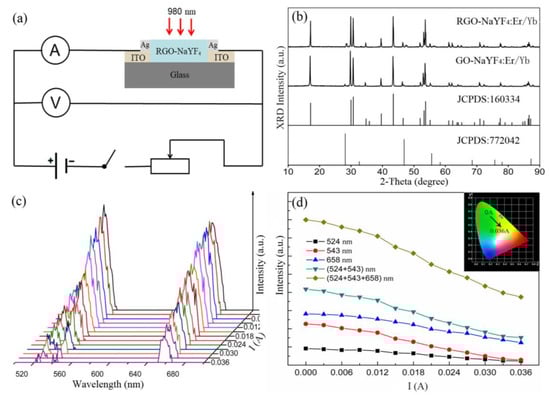 In order to study the performance quality of the variable-resistance sensor device, the measurement circuit is set up, as shown in Figure 2a. The sensor, irradiated by a fixed excitation source (980 nm), is connected to a series circuit composed solely of power supply, switch, sliding rheostat, voltmeter, and ammeter. The X-ray diffraction (XRD) patterns of GO-NaYF4:Yb3+,Er3+ and RGO-NaYF4:Yb3+,Er3+ as-prepared materials, show that the location and relative strengths of the diffraction peaks are capable of indexing to hexagonal (JCPDS Card no. 160334) and cubic (JCPDS Card no. 772042) mixed phase NaYF4 [,], as shown in Figure 2b. The up-conversion (UC) photoluminescence spectra of the sensor was measured with varying current under a fixed pump power (160.8 mW/mm2), among which, three emission bands were respectively ascribed to 2H11/2→4I15/2 (524 nm), 4S3/2→4I15/2 (543 nm), and 4F9/2→4I15/2 (658 nm) transitions of Er3+ ions [,,], as depicted in Figure 2c. The luminescence intensity of three UC emission bands decreased with the increasing current, as described in Figure 2d. The CIE chromaticity in the inset of Figure 2d displays that the emission color transforms from green to greenish-yellow with the current intensity increasing. It means that the spectra and resistance of sensor are dependent on the current. In this process, the Joule heat will be generated.
