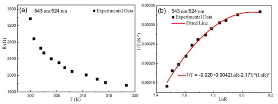 where T is in kelvin unit, R is the value of resistance, A, B and C are the fitted coefficients of curve. Based on the ratio of 543 nm/524 nm, the fitted curve of LnR dependent 1/T obtained according to Equation (1) was in good agreement with experimental values, and the coefficients of the Steinhart–Hart equation were: A = −0.02, B = 0.0042, C = −2.17E−5, as shown in Figure 3b.