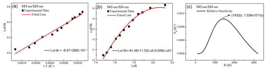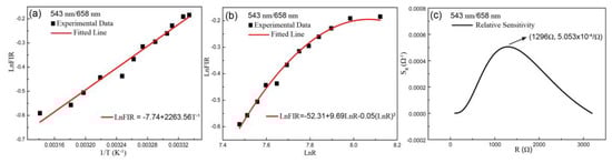 In the same theoretical analysis, it can be observed that the experimental values of temperature-resistance based on the ratio of 543 nm/658 nm still exhibits the characteristics of NTC resistance, as shown in Figure 5a. The curve of resistance-dependent temperature is fitted according to Steinhart–Hart equation in Figure 5b. The relation between 1/T and LnFIR based on the FIR of 543 nm/658nm is linear according to Boltzmann’s distribution law, as drawn in Figure 6a. The fitted curve of LnR dependent LnFIR matched well with the experimental points, as shown in Figure 6b. And the SR maximum value of 5.053 × 10−4/Ω at 1296 Ω was obtained, as shown in Figure 6c.
