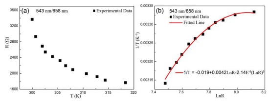 Plots of the ratio of 543 nm/658 nm including (a) the resistance–temperature experimental data, and (b) the fitted curve of resistance dependent temperature based on Steinhart–Hart formula.