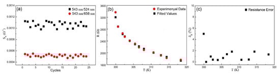 where R0 is the experimental data and R is the fitted value. The temperature dependence of δR is shown in Figure 7c. It can be observed that the resistance error δR is comparatively small and stable.