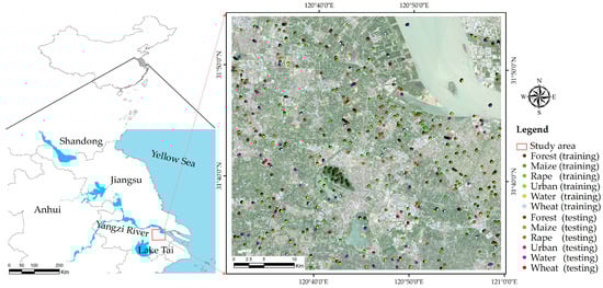 The study combined GNSS (Global Navigation Satellite System) field surveys and reference Google Earth images. Eight classes of surface type were identified: forest, maize, rape, urban, water, and wheat. We chose samples by visual interpretation of field validation and Google Earth images (image date: 6 May 2018). Then, the ground sample points were randomly separated into parts (50% training and 50% testing), and the accuracy was calculated (Table 3). The location of training samples and testing samples is shown in Figure 1.