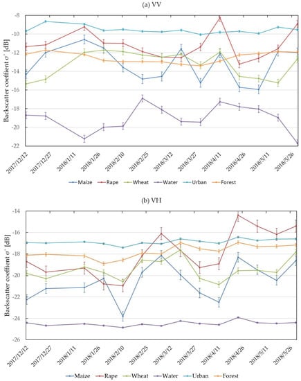 The study used training sample data which covered a complete growing season (from December 2017 to May 2018) of three crops using Sentinel-1 polarization data to monitoring the crop growth changes. Figure 2a–c shows the backscatter coefficient changes of the five land-cover classification time series. It can be observed that the mean VV backscatter coefficient values (Figure 2a) of maize, rape, wheat, urban, water, and forest were −13.26, −11.18, −13.22, −19.01, −9.55, and −12.53 dB, respectively. The mean VH backscatter coefficient values (Figure 2b) were 20.53, −17.92, −19.44, −24.49, −16.86, and −17.75 dB, respectively. The mean CR values (Figure 2c) were −7.16, −6.60, −6.01, −5.65, −7.32, and −5.25 dB, respectively. In addition, the VV and VH values of urban and water were relatively independent and separable for most of the growing period. The results showed that it was feasible to distinguish crops from other land-cover types using VV and VH features.
