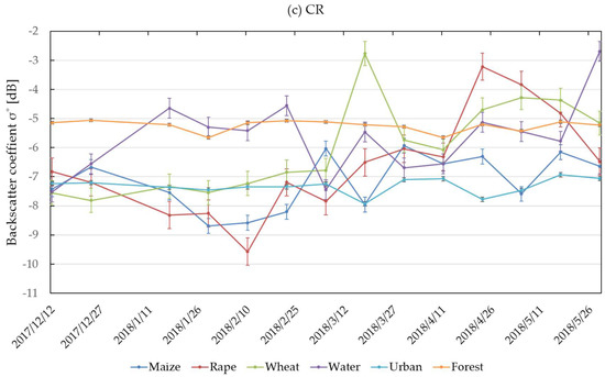 Six land cover features of Sentinel-1 backscatter coefficients of a time series: (a) (vertical-vertical) VV, (b) (vertical-horizontal) VH and (c) Cross Ratio (CR).
