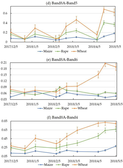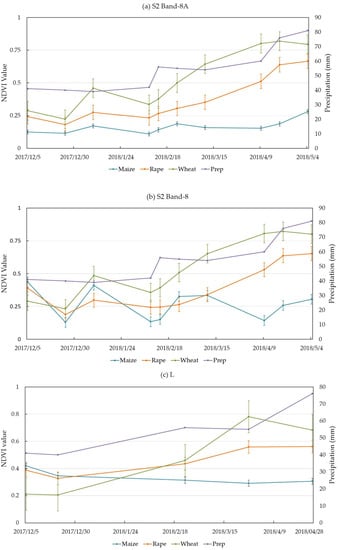 Figure 3a–c compares the NDVI values of S2 Band-8A, S2 Band-8, and L and shows that the NDVI increased with the precipitations. Figure 3a shows that rapeseed and wheat had similar NDVI values in the early growth season. Moreover, they significantly differed in similar seasons. Because the phenology and structure of the two crops are obviously different, they had significant differences in the intermediate and late seasons. Maize did not significantly change from the early season to the grown season. Moreover, the total tendency of NDVI change was an increase when there was a large amount of precipitation. Precipitation in the growing season increased from December 2017 to May 2018. In Figure 3b, the three crops are shown to be different throughout the whole growth period. Wheat and rapeseed showed larger increases from December 2017 to May 2018 than maize. This is because the maize growth period began in March 2018. During growth, all of them showed more differences. Figure 3c L shows that the three crops had similar NDVI values during the growth period. It is obvious that there were large differences in the middle growth period. When comparing S2 Band-8A (Figure 3a), S2 Band-8 (Figure 3b), and L (Figure 3c), the S2 Band-8A showed more differences over the whole growth period. This certificated that the NDVI edge is more sensitive than the NDVI spectral features. This result could provide an effective way to identify the status of crop growth.