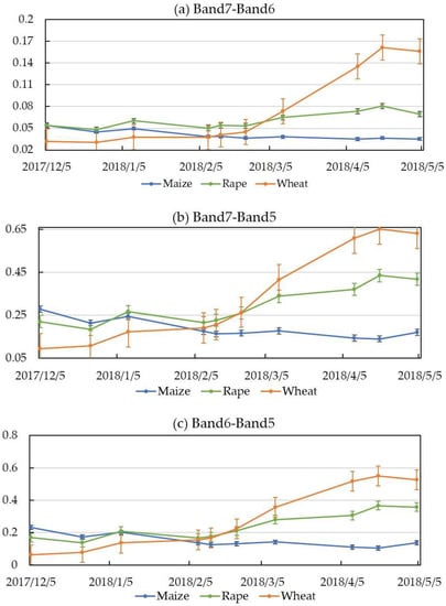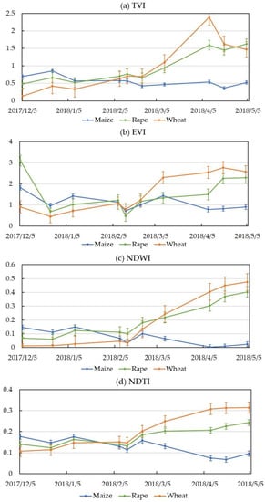 Figure 5 shows the time series of the TVI, EVI, NDWI, and NDTI indices of the three crops (maize, rapeseed, and wheat). The results indicated that most of the indices could be separated from March to May and they were especially significantly independent during the maturity period of crops. All the indices were better separated in the late grow season than in the early grow season. This can be explained by the fact that the leaf water content of wheat, rape, and maize increased differently as their grow status changed. Moreover, maize showed obviously different changes compared with wheat and rape from the March to May. This is because maize has a different growing season (from March to June) and phenological period compared with wheat and rape. In summary, the indices of optical images showed a potential to identify crop types.
