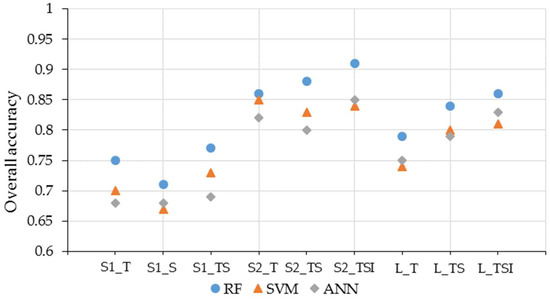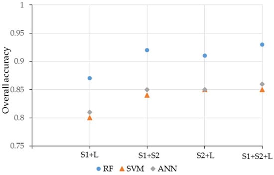 Figure 6 compares the effects of the RF, SVM, and ANN classification algorithms. All scenarios showed that the RF classifier performed better than the SVM and ANN classifiers. The SVM and ANN classifiers produced similar classification results. When using single datasets, the classification accuracy of SVM was slightly higher than that of ANN. Then, the number of features was higher than when using a single dataset. When the three data types were combined, the accuracy of ANN was higher than that of SVM; conversely, RF’s accuracy remained the best.