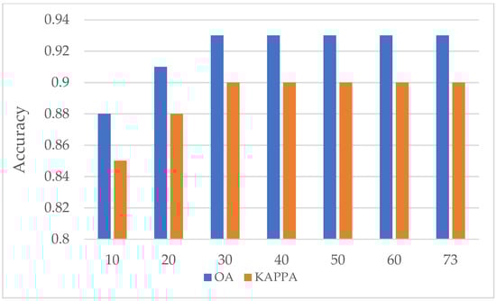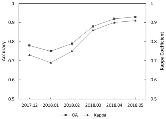 Figure 10 shows the performance of the combination of S1, S2, and L data to identify crops in the crop growing period. It is obviously shown that in the flowering period (May), the crops acquired the best OA and Kappa coefficient. The plot shows a tendency for the accuracy to decrease in January 2018, which is because the rapeseed and wheat were covered by snow or rain in the winter season. After greening (February 2018), rape and wheat leaf can, obviously, be monitored. During March 2018, the accuracy increased until it reached its highest value; the reason for this is that maize was sowed, and the crops flowered (April 2018) and matured (May 2018).